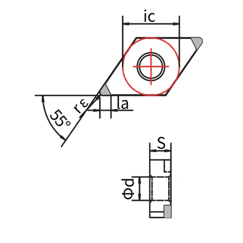 | ISO Code | ANSI Code | Spitzen | Ausführung | Schneidenlänge | Lochdurchmesser | Dicke | Eckenradius | Spitzenlänge | H | K | S |