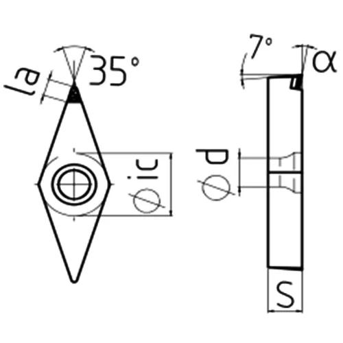 | ISO Code | ANSI Code | Spitzen | Schneidenlänge | Lochdurchmesser | Dicke | Freiwinkel | Eckenradius | Spitzenlänge |